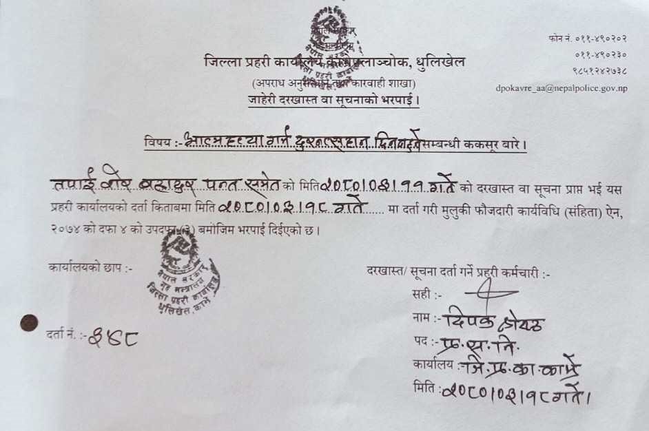 भुम्लु गाउँपालिका वडा नम्बर १ स्थित सापिङ्गका ६८ वर्षीय ठडेन्द्रबहादुर पन्तको हत्या वा आत्महत्या हुन सक्ने भन्दै ठडेन्द्रका छोरा २१ वर्षीय शेरबहादुर पन्त र ३६ वर्षीय भतिज रोमबहादुर पन्तले आत्महत्या गर्न दुरुत्साहन गरेको अभियोगमा जिल्ला प्रहरी कार्यालय काभ्रेपलाञ्चोकमा दिएको जाहेरी दिनु भएको थियो ।