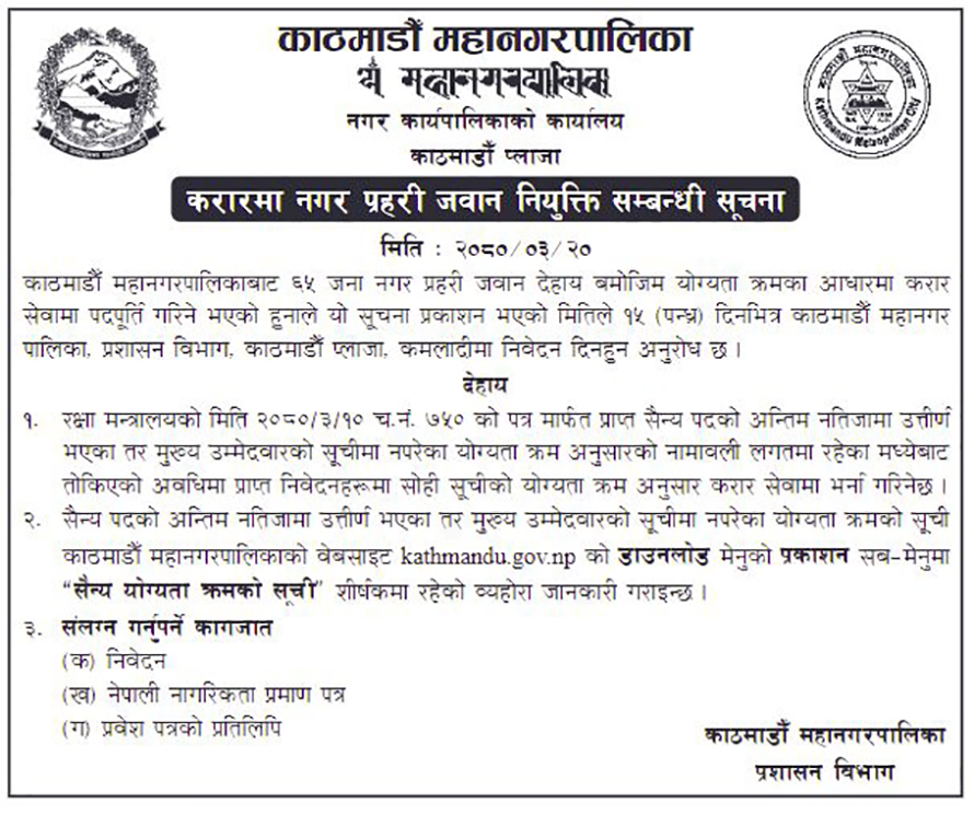 काठमाडौँ महानगरपालिकाले ६५ जना नगर प्रहरीको माग गरेको छ । महानगरले बुधबार सूचना प्रकाशित गरेर सैन्य पदको वैकल्पिक सूचीमा रहेकाहरुलाई करारमा नगर प्रहरीमा लिने जनाएको छ ।