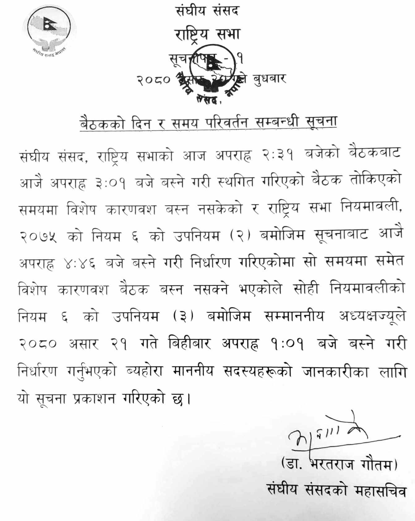 बुधबार नै बस्नेगरी स्थगित भएको राष्ट्रिय सभाको बैठक बिहीबार बस्ने भएको छ । बुधबार दिउँसो २ः३१ बजे बसेको बैठक एमाले सांसदको अवरोधपछि ३ः०१ बजे बस्नेगरी स्थगित भएको बैठक विशेष कारण देखाएर बिहीबार दिउँसो १ः०१ बजे बस्नेगरी समय निर्धारण गरिएको संघीय संसद सचिवालयका महासचिव डा .भरतराज गौतमले जानकारी दिए ।