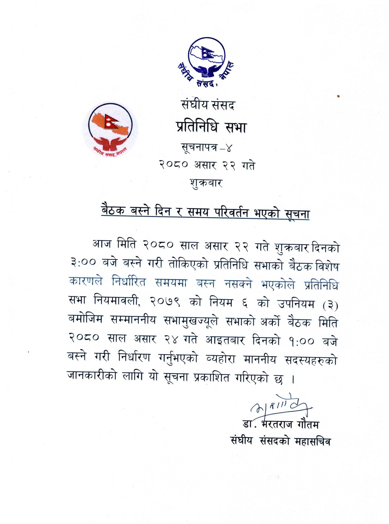 प्रतिनिधिसभाको बैठक सूचना टाँसेर स्थगित गरिएको छ । शुक्रबार अपरान्ह ३ बजेका लागि बोलाइएको प्रतिनिधिसभा बैठक सूचना टाँसेर आइतबार दिउँसो १ बजे बस्नेगरी स्थगित गरिएको हो ।