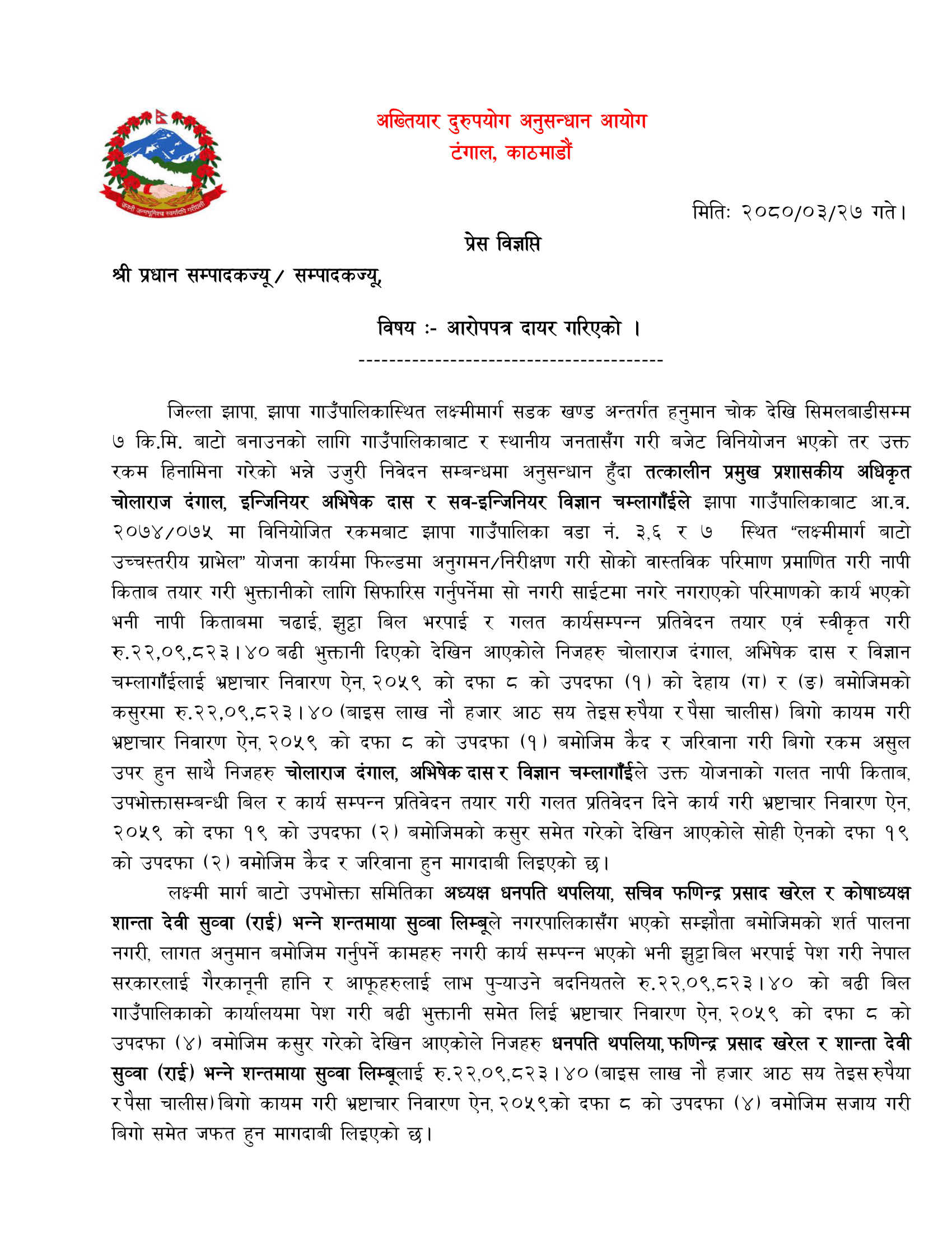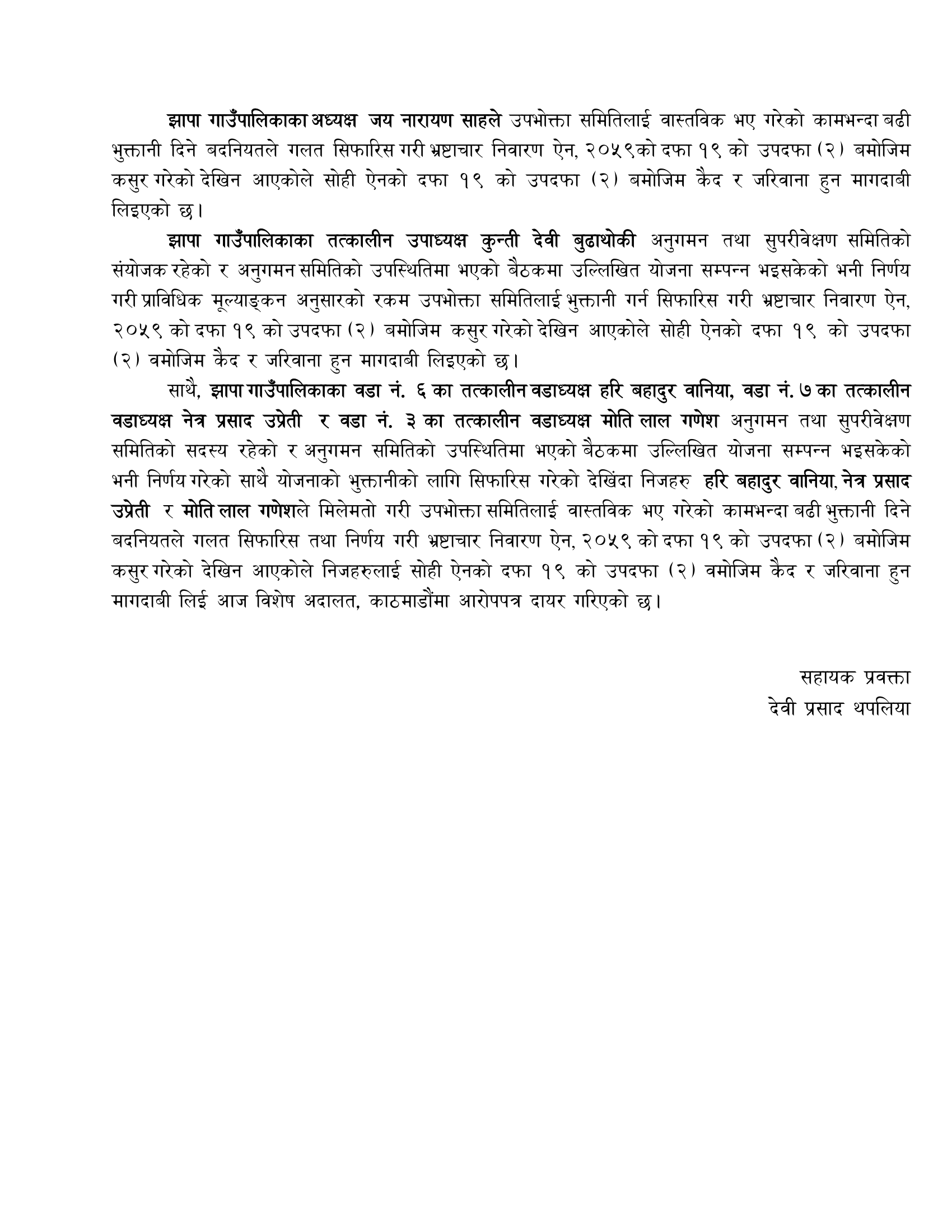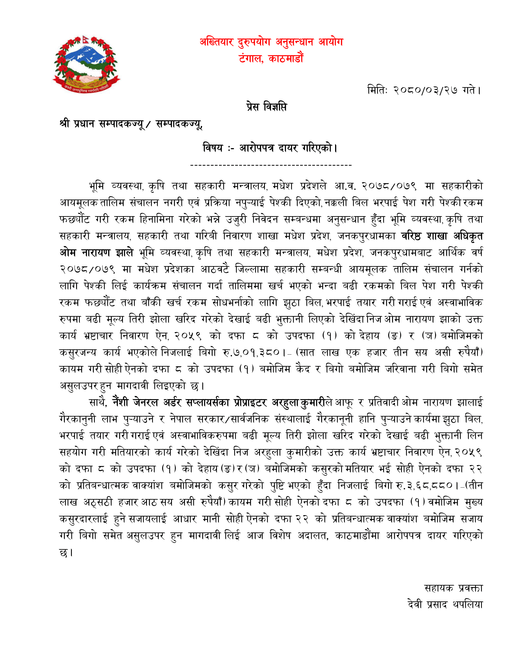 भूमि व्यवस्था, कृषि तथा सहकारी मन्त्रालय, सहकारी तथा गरिबी निवारण शाखा मधेश प्रदेश, जनकपुरधामका वरिष्ठ शाखा अधिकृत ओमनारायण झा, नैँशी जेनरल अर्डर सप्लायर्सका प्रोप्राइटर अरहुला कुमारी तथा ११ जनाविरुद्ध विशेष अदालतमा भ्रष्टाचारको मुद्दा दायर गरेको आयोगका सहायक प्रवक्ता देवीप्रसाद थपलियाले जानकारी दिए ।