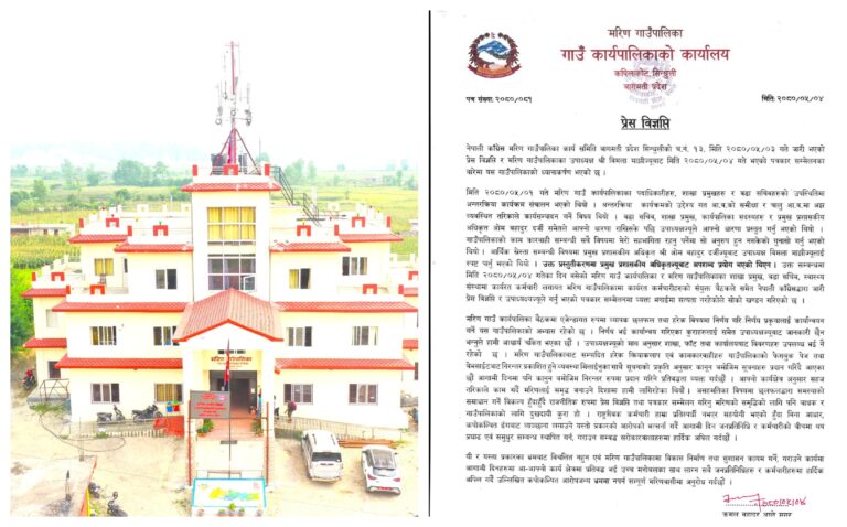 गाउँपालिकाका प्रवक्ता कमलबहादुर आले मगरको हस्ताक्षर रहेको विज्ञप्तीमा भनिएको छ, ‘भदौं ४ गते वसेको मरिणगाउँ कार्यपालिका र शाखा प्रमुख, वडासचिव, स्वास्थ्य संस्थामा कार्यरत कर्मचारीलगायत मरिण गाउँपालिकामा कार्यरत कर्मचारीहरुको संयुक्त बैठकले समेत नेपाली कांग्रेसद्वारा जारी प्रेस विज्ञप्ति र उपाध्यक्ष्यज्यूले गर्नुभएको पत्रकार सम्मेलनमा व्यक्त भनाइमा सत्यता नरहेकोले सोको खण्डन गरिएको छ’ ।