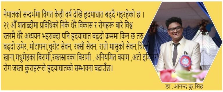 उमेर बढ्दै गएपछि मुटुको नसाहरूमा बोसो जस्ता बस्तु थुप्रिँदै जान्छ र नसाहरू बिस्तारै साँगुरिँदै जान्छ । ७०५ भन्दा बढी नसा बन्द भए पश्चात् छाती दुख्ने र हृदयाघात हुने गर्दछ । नेपालको सन्दर्भमा विगत केही वर्ष देखि हृदयाघात बढ्दै गइरहेको छ । २१ औँ शताब्दीमा प्रविधिको निकै धेरै विकास र रोगहरू बारे विश्व स्तरमै धेरै अध्ययन भइसक्दा पनि हृदयाघात बढ्दो क्रममा किन छ त ?