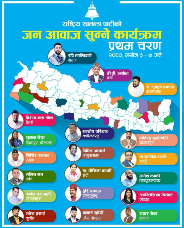 पार्टी सभापति रवि लामिछाने रोल्पा जाने भएका छन् । पार्टी उपसभापति डोलप्रसाद अर्याल मधेस प्रदेशअन्तर्गत पर्सा जाने छन्। महामन्त्री ढकाल कालिकोट जानेछन्। संसदीय दलका उपनेता विराजभक्त श्रेष्ठ बैतडी, सुमना श्रेष्ठ कैलालीको टीकापुर, शिशिर खनाल रसुवा, मनिष झा पर्वत, गणेश पराजुली ओखलढुंगा जाने ढकालले जानकारी दिए।