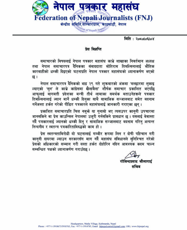 समाचारको विषयलाई लिएर महासंघ काभ्रे शाखाका निवर्तमान अध्यक्ष तथा नेपाल समाचारपत्र दैनिकका संवाददाता मोतिराम तिमल्सिनालाई भौतिक कारबाहीको धम्की दिइएको घटनाप्रति नेपाल पत्रकार महासंघले ध्यानाकर्षण भएको जनाएको छ। बिहीबार नेपाल पत्रकार महासंघले प्रेस विज्ञप्ति प्रकाशित गरी सरकारको ध्यानाकर्षण गराएको हो।