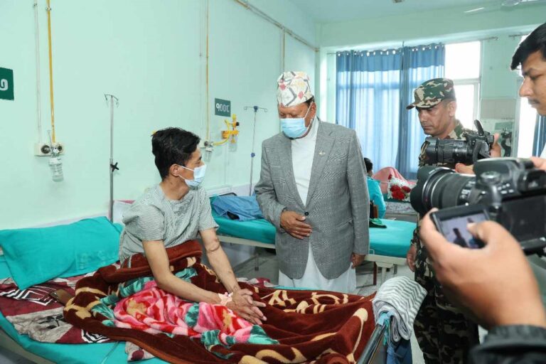जाजरकोट र पश्चिम रुकुममा कात्तिक १७ गते आएको विनाशकारी भूकम्पमा परेर गम्भीर घाइते भएपछि थप उपचारका लागि काठमाडौंको त्रिवि शिक्षण अस्पताल (टिचिङ) ल्याइएका उपचाररत घाइतेलाई स्वास्थ्य तथा जनसंख्या मन्त्री मोहन बहादुर बस्नेतले भेटेका छन् ।