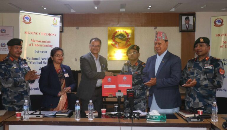 स्वास्थ्य तथा जनसंख्या मन्त्रालयमा शुक्रबार आयोजित समारोहमा न्याम्सका उपकुलपति प्रा.डा.भुपेन्द्र बस्नेत र नेपाल सशस्त्र प्रहरी अस्पतालका मेडिकल डाइरेक्टर डा.रुपक महर्जनले भविष्यमा न्याम्सले सशस्त्र प्रहरी अस्पतालमा आफ्ना शैक्षिक कार्यक्रम बिस्तार गर्ने समझदारी पत्रमा हस्ताक्षर गरेका हुन ।