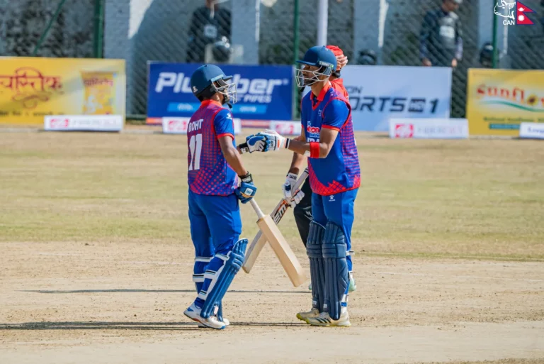 खेलको २३ ओभर ५ बलमा नेपालको १ सय ५० रन पूरा भएको हो । अहिले क्रिजमा कप्तान रोहित पौडेल र यू १९ टिमका कप्तान देव खनालले ब्याटिङ गरिरहेका छन् ।