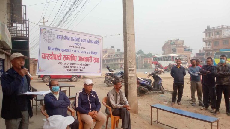 आदर्श डाँंगाचा चारदोवाटो कायम गर्न माग समिति २०८१ डाँंगाचा आदर्श भक्तपुर गठन गरेका उनीहरुले सोही समितिको आयोजनामा चोकमा सभा गरेको हो । सिपाडोल मुलबाटो र भक्तपुर नगरपालिका वडा नं ५ र ७ वीचको चारदोवाटो खुल्ला राख्न मागसहित आफूहरुले गरेको र्सघर्षहरुबारे टोलबासीहरुलाई जानकारी दिन यस सम्वन्धी जानकारी सभा भएको हो ।