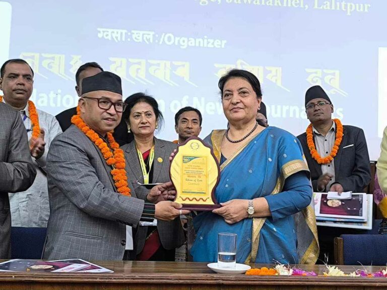 नेपाल भाषाको पत्रकारिता क्षेत्र र नेपालभाषाको संरक्षणमा महत्वपूर्ण योगदान पुर्याउनुभएका चार व्यक्तित्वहरूलाई शनिबार सम्मान गरियो। सम्मानित हुनेहरूमा नेपालभाषा टाइम्सका पूर्व सम्पादक एवं भाषा आयोगका सदस्य सुरेशकिरण मानन्धर, वरिष्ठ पत्रकार श्रीकृष्ण महर्जन, काठमाडौं महानगरपालिकाका पूर्वमेयर विद्यासुन्दर शाक्य र गुठी संस्थानका केन्द्रीय प्रशासक किरण शाक्यलाई सम्मान गरिएको हो। सम्मानित हुनेहरूलाई पत्रकार राष्ट्रिय दबूका केन्द्रीय अध्यक्ष नृपेन्द्रलाल श्रेष्ठले दोसल्ला र पूर्वराष्ट्रपति विद्यादेवी भण्डारीले सम्मानपत्र प्रदान गर्नुभयो।