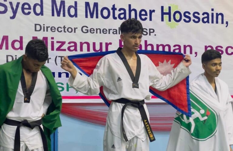 नेपालका आयुष ढुंगेलले बंगलादेशको ढाकामा भएको प्रथम बिकेएसपी अन्तर्राष्ट्रिय तेक्वान्दो च्याम्पियन्सीपमा स्वर्ण पदक जितेका छन्। आयुषले पुरुष ६३ केजी तौल समूहको उपाधि भिडन्तमा आयोजक राष्ट्रका अल सुवेद राइमलाई हराएका हुन् ।