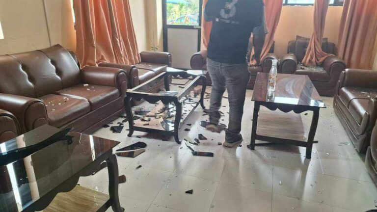 स्थानीयको आक्रमणका कारण नगरपालिका भवनको पूर्वतर्फको झ्यालढोका फुटेका छन् ।