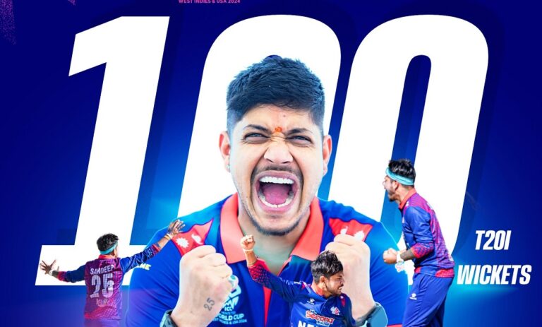 सन्दीप लामिछानेले टी-२० अन्तर्राष्ट्रिय क्रिकेटमा १०० विकेट पुरा गरेका छन्। सन्दीपले जारी टी-२० विश्वकपमा बंगलादेशविरुद्ध २ विकेट लिएसँगै आफ्नो सय विकेट पुरा गरेका हुन्।
