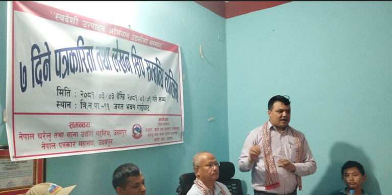 उदयपुरको गाईघाटमा घरेलु तथा साना उद्योग कार्यालय को आयोजना तथा नेपाल घरेलु तथा साना उद्योग महासंघको समन्वय र नेपाल पत्रकार महासंघ उदयपुरको सहजीकरणमा सोमबारदेखि पत्रकारिता तथा लेखन सीप सम्बन्धी तालिम प्रारम्भ भएको छ ।