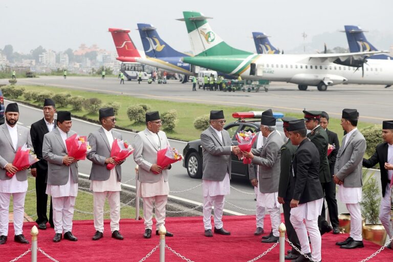 राष्ट्रपति पौडेललाई त्रिभुवन अन्तर्राष्ट्रिय विमानस्थलको अतिविशिष्ट कक्षमा उपराष्ट्रपति रामसहायप्रसाद यादव र प्रधानमन्त्री पुष्पकमल दाहाल ‘प्रचण्ड’ले स्वागत गरे। राष्ट्रपति पौडेलको स्वागतका लागि विमानस्थलमा राष्ट्रियसभाका अध्यक्ष, उपप्रधानमन्त्रीहरू, मन्त्रीगण, सुरक्षा निकायका प्रमुख, सरकारका उच्चपदस्थ अधिकारी, यहाँस्थित कूटनीतिक नियोगका प्रमुख एवं प्रतिनिधि उपस्थित थिए।