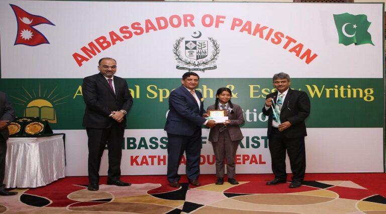 नेपालस्थित पाकिस्तानी दूतावासले ११ औं वार्षिक निबन्ध लेखन प्रतियोगिता र ७ औं वार्षिक वक्तृत्वकला प्रतियोगिता सम्पन्न गरेको छ । दूतावासले बुधवार राजधानीमा एक कार्यक्रमको आयोजना गरी दुवै प्रतियोगिताका विजेता विद्यार्थीहरुलाई पुरस्कार वितरण गरेको थियो ।