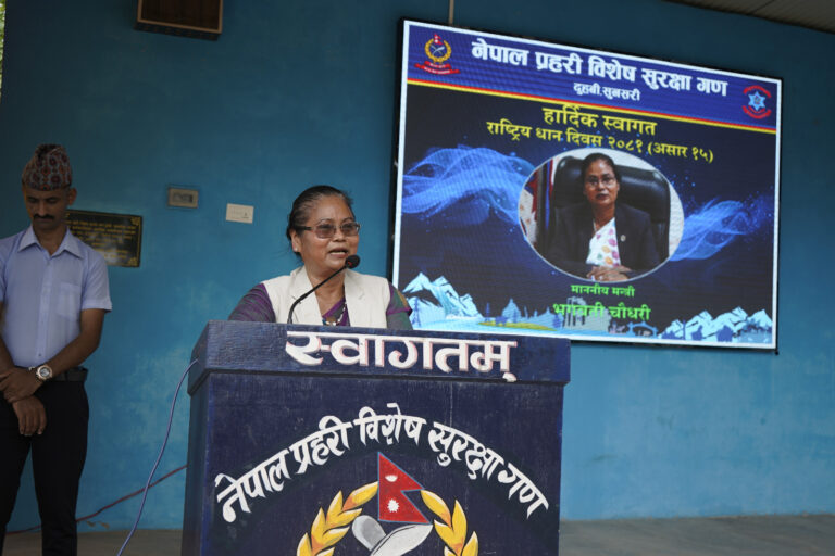 आज नेपाल प्रहरी विशेष सुरक्षा गण दुहबी सुनसरीले राष्ट्रिय धान दिवसको अवसरमा आयोजना गरेको विशेष कार्यक्रमलाई सम्बोधन गर्दै मन्त्री चौधरीले त्यस्तो बताउनुभएको हो । शान्ति सुरक्षा कायम गर्नका निम्ति सुरक्षा निकायको विशेष भूमिका रहेको भन्दै उहाँले जो जहाँ छ त्यो व्यक्ति वा निकायले देश र समाजका निम्ति विशेष भूमिका खेल्नुपर्ने बताउनुभयो ।
