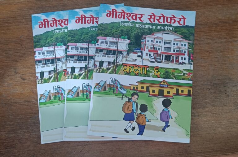 भीमेश्वर नगरपालिकाले स्थानीय पाठ्यक्रममा आधारित कक्षा ६, ७ र ८ मा अध्यापन गराईने भीमेश्वर सेरोफेरो पुस्तकमा विपद् र त्यसको न्युनिकरणको उपाएका विषयहरु समावेश गरेको शिक्षा शाखा प्रमुख अर्जुन कार्कीले बताउनु भयो । स्थानीय पाठ्यक्रममा आधारित भीमेश्वर सेरोफेरोमा समावेश गराईएका विपद् सम्बन्धि विषयवस्तु निक्कै प्रभावकारी रहेको शिक्षा शाखा प्रमुख कार्कीको भनाई छ ।