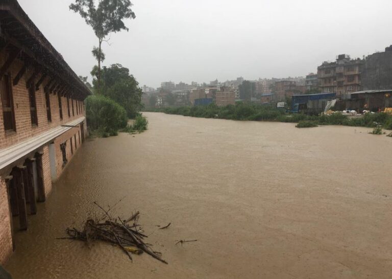 भारी वर्षाका कारण भक्तपुरको हनुमन्ते खोलामा आएको बाढी बस्तीमा पस्न थालेको छ ।