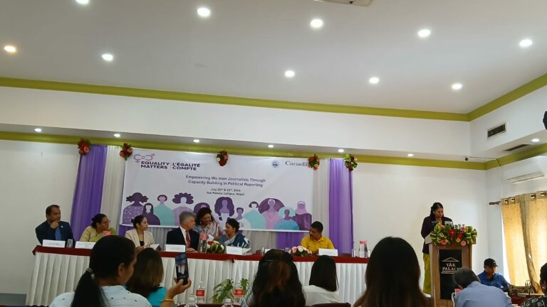 सोमबार ललितपुरमा भएको ‘इम्पावरिङ वुमन जर्नलिस्ट थ्रु क्यापासिटी बिल्डिङ इन पोलिटिकल रेपोर्टिङ’ कार्यक्रममा मन्त्री भट्टराईले यस्ताे बताएकी हुन् । मन्त्री भट्टराईले ‘शिक्षा र सञ्चारलाई प्रविधिसँग जोडनुपर्छ, विश्व एआइमा पुगिसकेको अवस्थामा हामीले प्रविधिको अधिकतम प्रयोग गर्नुपर्छ, सञ्चारमाध्यममा राजनीतिका विषयमा समाचार सङ्कलन गर्ने पत्रकार महिलालाई प्रोत्साहन गर्न जरुरी छ, यो क्षेत्रमा महिला सहभागिता ३३ प्रतिशत हुनुपर्ने बताइन् ।
