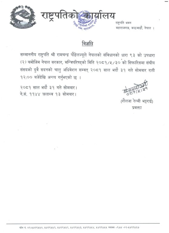 यस अघि आइतबार बसेको मन्त्रिपरिषद्को बैठकले संसदको चालु अधिवेशन अन्त्य गर्न सिफारिस गरेको थियो ।