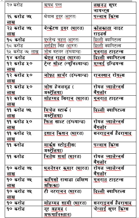 आईपीएल २०२५ का १० करोडदेखिका खेलाडी (भारुमा)