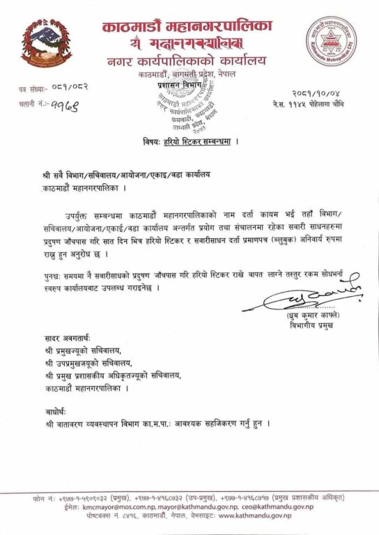 कामपाले शुक्रबार आफ्नो मातहतमा रहेका विभाग/ सचिवालय/आयोजना/ एकाई/वडा कार्यालय अन्तर्गत प्रयोग तथा संचालनमा रहेका सवारी साधनहरुमा प्रदुषण जाँचपास गरी सात दिन भित्र हरियो स्टिकर र सवारीसाधन दर्ता प्रमाणपत्र (ब्लुबुक) अनिवार्य रुपमा राख्न निर्देशन दिएको हो।