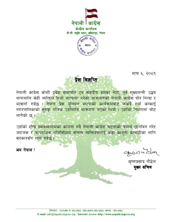 नेपाली कांग्रेसले पार्टीका कोशी प्रदेश सभापति एवं संसदीय दलका नेता, पूर्वमुख्यमन्त्री उद्धव थापामाथि केही व्यक्तिले शनिबार झापामा गरेको आक्रमणको निन्दा र भत्र्सना गरेको छ ।