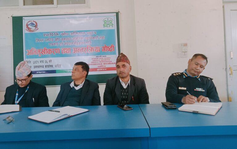 जनस्वास्थ्य कार्यालय धादिङमा जिल्ला समन्वय समितिका प्रमुख नवराज अधिकारीको अध्यक्षतामा भएको कार्यक्रममा जिल्ला भरका कक्षा ६ देखि १० सम्मका र विद्यालय बाहिर रहेका १० वर्षदेखि १४ वर्ष सम्मका किशोरीहरुलाई खोप लगाइने जानकारी दिइयो ।