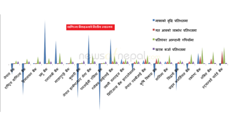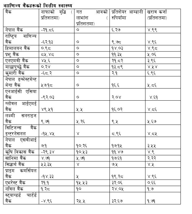 कुल २० वटा बैंकमध्ये ९ वाणिज्य बैंकको नाफामा घटेको छ । जसमध्ये ११ बैंकको नाफा बढेको छ । नाफामा बढाउन प्रभु बैंक अगाडि देखिएको छ। यस बैंकको नाफा ८५ दशमलव ४८ प्रतिशतले बढेको छ । प्रभुपछि एनआईएमबी, ग्लोबल आईएमई, एनएमबी बैंकको नाफामा पनि उल्लेख्य सुधार भएको छ । तर, एनआईसी एसिया, कुमारी, राष्ट्रिय वाणिज्य र सिद्धार्थलगायत बैंकको नाफामा उच्च गिरावट देखिएको छ। बैंकहरूको कर्जा असुली नहुँदा लोन लस प्रोभिजन वृद्धि हुँदा नाफामा गिरावट छ आएको हो । नाफा उच्च दरले घट्ने बैंकहरूमा कुमारी, राष्ट्रिय वाणिज्य र सिद्धार्थ छन्।