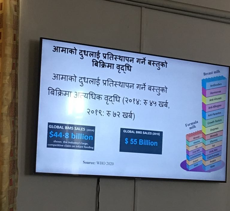 आमाको दूधलाई प्रतिस्थापन गर्ने बस्तुको विक्रीमा अत्यधिक वृद्धि भएको छ । कानुनका बारेमा पैरवी छैन । नेपालमा सन् २०१४ मा रु.४५ खर्बको आयात गरिएको थियो भने सन् २०१९ मा पुग्दा रु.७२ खर्बको आयात गरिएको देखिन्छ । यति मात्र नभै २०४९ सालमा ७० प्रतिशतले पूर्ण स्तनपान गराउँथे । स्तनपान गराउँदा आमालाई हुनसक्ने घातक रोगबाट जोगाउन सकिने अध्ययनले देखाएको छ । त्यस्तै स्तनपान गराउँदा क्यान्सर जस्ता रोगको जोखिम कम हुने पनि उहाँले बताउनुभयो । बाल मृत्युदरमा कमी ल्याउन, निरोगी बनाउन तथा विभिन्न किसिमका स्वास्थ्य समस्याबाट जोगाउन सकिने हुँदा हरेक आमालाई पूर्ण स्तनपान गराउन आग्रह गर्नुभयो ।