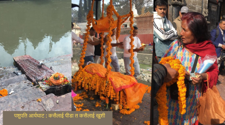 पाठपूजा र मृत्यु संस्कारको साक्षीका रुपमा धेरैपटक पशुपति मन्दिर र यहाँको आर्यघाटमा पुगियो । यसै क्रममा कामना न्यूज पब्लिकेसन्स् प्रा.लि.का संस्थापक एवं नेपालको पत्रकारिताका धरोहर पुष्करलाल श्रेष्ठको अन्त्येष्टिमा सामेल हुन ५ वर्षअघि आर्यघाटमा पुगेको थिएँ । २०७६ वैशाख ४ गते साँझको समय पशुपतिस्थित आर्यघाट पुग्दा बागमती नदीकिनारमा रहेका चित्ताहरुमा पुष्करलाल श्रेष्ठसहित धेरै व्यक्तिका शव जलिरहेका थिए । मान्छे बित्दाको पीडा परिवारजन र आफन्तमा असह्य भएको त्यहाँको दृश्यले अनुभूत गर्न सकिन्थ्यो । तर त्यहाँ पिउने पानी, फूल–माला अदि बिक्री गर्न जुर्मुराएर आएका अव्यवस्थित व्यापारीहरुको मुहारमा भने खुशी र क्रोध मिश्रित थियो। यस मानेमा कि आफ्नो सामान कसैले किन्यो भने खुशी र किनेनन् भने क्रोधको भाव झल्कन्थ्यो।