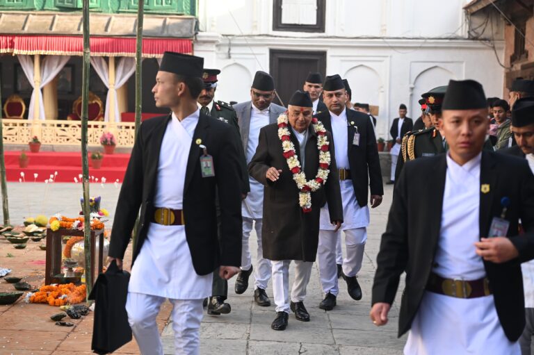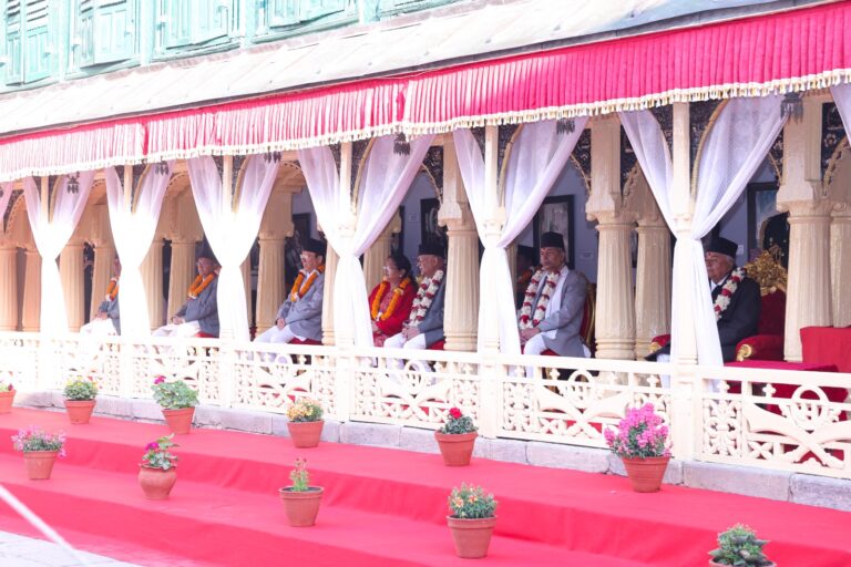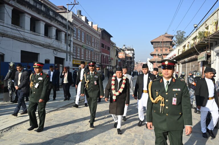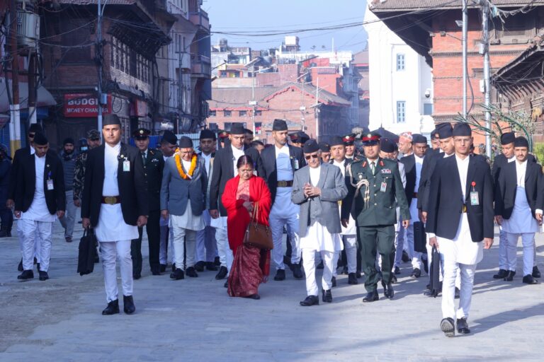 राष्ट्रपतिलाई नेपाली सेनाको एक टुकडीले सलामी अर्पण गर्नुका साथै पञ्चेबाजाले स्वागत गरिएको थियो। समारोहमा उपराष्ट्रपति रामसहायप्रसाद यादव, प्रधानमन्त्री केपी शर्मा ओली, प्रधानन्यायाधीश प्रकाशमानसिंह राउत, सभामुख देवराज घिमिरे र राष्ट्रियसभाका अध्यक्ष नारायणप्रसाद दाहाल उपस्थित थिए।