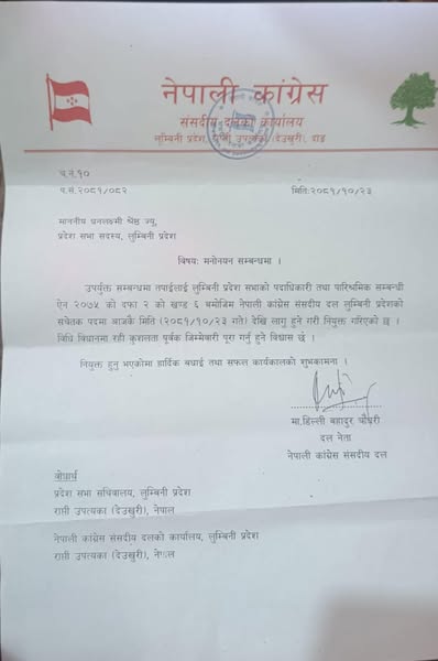 लुम्बिनी प्रदेश सभा संसदीय दलका नेता डिल्लीबहादुर चौधरीले बुधबार एक विज्ञप्ति जारी गरी श्रेष्ठलाई सचेतकमा मनोनयन गरिएको जनाएका छन्।