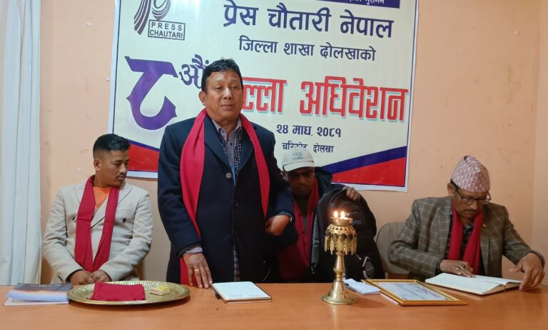 प्रेस चौतारी नेपाल दोलखाको आठौ जिल्ला अधिवेशनले पत्रकार श्रृजन कुमार घिमिरेको अध्यक्षतामा नयाँ कार्यसमितिको चयन समेत गरेको छ । समितिको उपाध्यक्षमा अर्जुन पाख्रीन, समावेशी उपाध्यक्षमा लाक्पाली शेर्पा, सचिवमा गणेश बुढाथोकी, कोषाध्यक्षमा फुर्वा तमाङ र सहसचिवमा सुजन थामी तथा प्रकाश वस्नेतलाई चयन गरेको छ ।