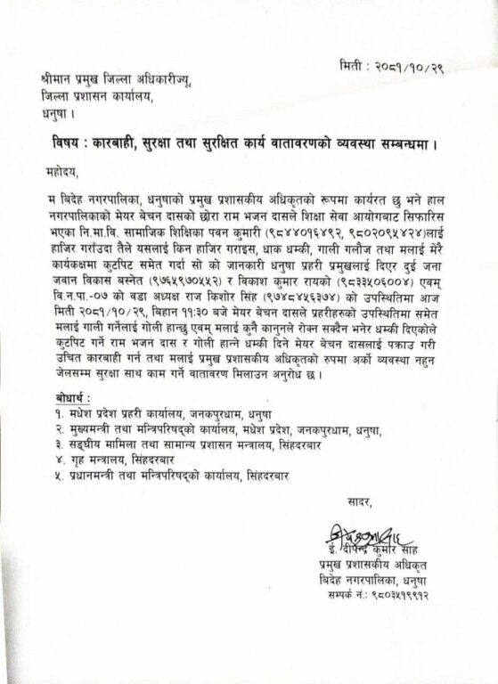 आफूमाथि हातपात भएको भन्दै प्रमुख प्रशासकीय अधिकृत साहले सुरक्षाको माग गर्दै मंगलबार जिल्ला प्रशासन कार्यालय धनुषामा उजुरी दिएका छन् । साहले हातपात गर्ने मेयरका छोरा र गोलीले उडाइदिने धम्की दिने मेयर दासमाथि उचित कारबाहीको माग गर्दै जिल्ला प्रशासन कार्यालय धनुषामा निवेदन दिएका हुन् ।
