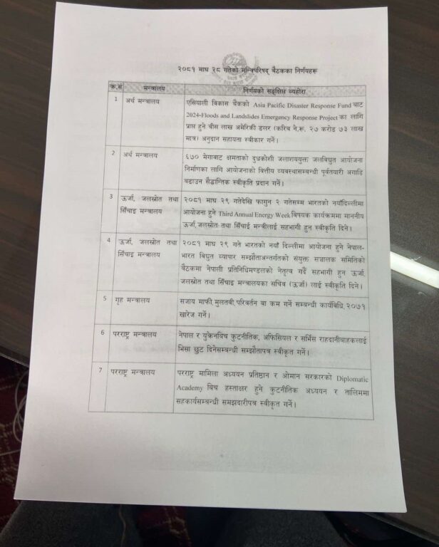 सरकारले मन्त्रिपरिषद् बैठकका निर्णय सार्वजनिक गरेको छ। बुधबार सरकारका प्रवक्ता एवम् सञ्चार तथा सूचना प्रविधिमन्त्री पृथ्वीसुब्बा गुरुङले पत्रकार सम्मेलन गर्दै माघ २८ गते बसेको मन्त्रिपरिषद् बैठकका निर्णय सार्वजनिक गरेका हुन् ।