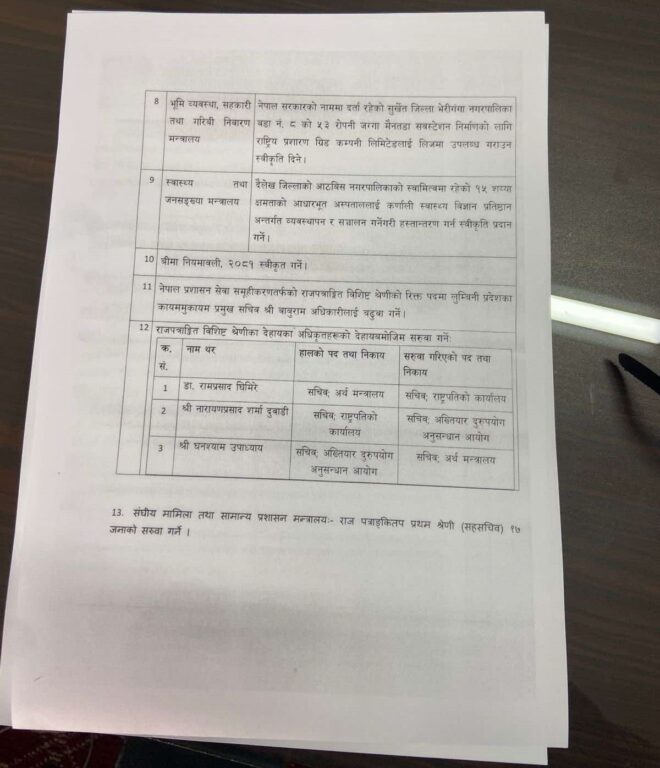 बैठकले सचिवको सरुवासहित महत्त्वपूर्ण १३ निर्णय गरेको छ।