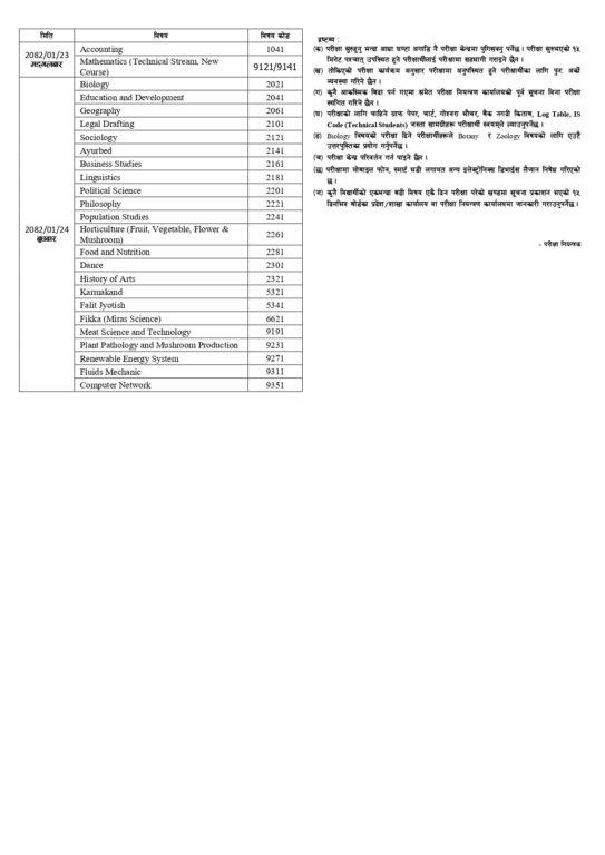 २०८२ मा हुने कक्षा १२ को बार्षिक परीक्षा तालिका सार्वजनिक भएको छ । राष्ट्रिय परीक्षा बोर्ड,परीक्षा नियन्त्रण कार्यालय सानोठिमी भक्तपुरले साधारण, परम्परागत र प्राविधिक विषय समूह तर्फका नयाँ तथा पुरानो पाठ्यक्रम एवं ग्रेड वृद्धिको परीक्षा तालिका सार्वजनिक गरेको हो । परीक्षा तालिका अनुसार वैशाख ११ देखि परीक्षा सुरु हुनेछ ।
