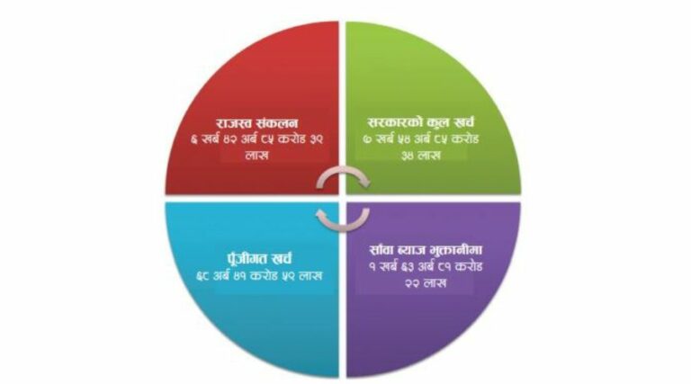 त्यस्तै, सरकारले चालूतर्फ ५ खर्ब २२ अर्ब ६२ करोड ५३ लाख, पुँजीगततर्फ ६८ अर्ब ४१ करोड ५९ लाख र ऋणको साँवा ब्याज भुक्तानीमा १ खर्ब ६३ अर्ब ८१ करोड २२ लाख रुपियाँ खर्च गरेको छ । सरकारी खर्चको तथ्यांक हेर्दा राजस्व आम्दानीले तलब तथा अन्य सुविधाको भुक्तानी गर्न चालू खर्चलाई मात्र पुग्ने देखिएको छ । विकास खर्च र ऋणको साँवा ब्याज तिर्न सरकारले आन्तरिक र बाह्य ऋण लिनुपर्ने बाध्यता सिर्जना भएको छ ।
