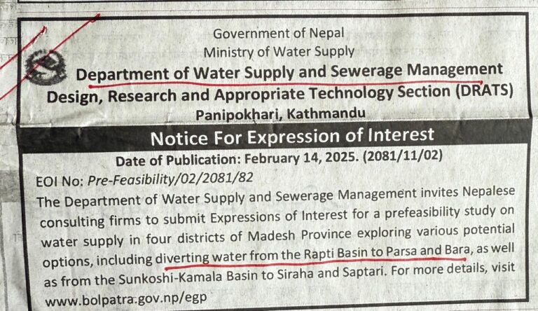 नेपाल सरकार, खानेपनी मन्त्रालय अन्तरगतको खानेपानी तथा ढल व्यवस्थापन विभागले हेटौँडाको राप्ती नदीबाट पर्सा र बारा जिल्लामा पानी आपूर्ति सम्भाव्यता अध्ययन गर्ने भएको छ । यसको लागि विभागले परामर्शदाताहरुबाट आशय पत्र (डेण्डर) आह्वान गरेको छ ।