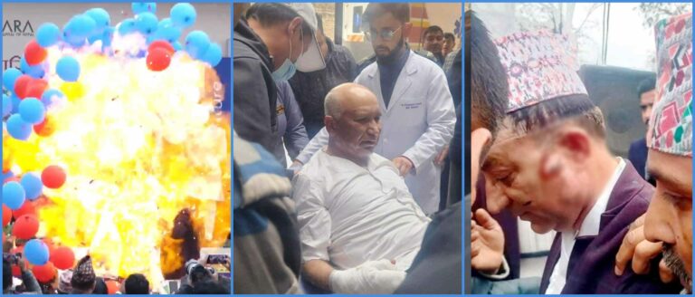 शनिवार पोखरा भ्रमण वर्ष २०२५ को उद्घाटनका क्रममा बेलुन विष्फोटमा परी संघीय सरकारका उपप्रधानमन्त्री तथा अर्थमन्त्री विष्णुप्रसाद पौडेल र पोखरा महानगरपालिाकाका मेयर धनराज आचार्य घाइते हुनुभएको छ । घाइते दुवैलाई पोखरामा प्राथमिक उपचारपछि थप उपचारका लागि काठमाडौं लगिएको छ ।