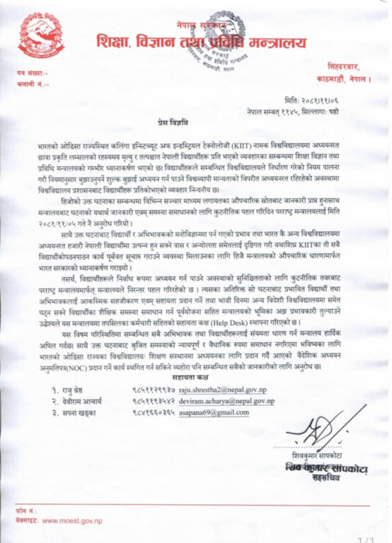 केआईआईटीमा अध्ययनरत नेपाली छात्रा लम्सालको रहस्यमय मृत्यु भएको थियो । त्यसपछि नेपाली विद्यार्थीहरूप्रति भएको व्यवहारका सम्बन्धमा मन्त्रालयको गम्भीर ध्यानाकर्षण भएको जनाएको हो ।