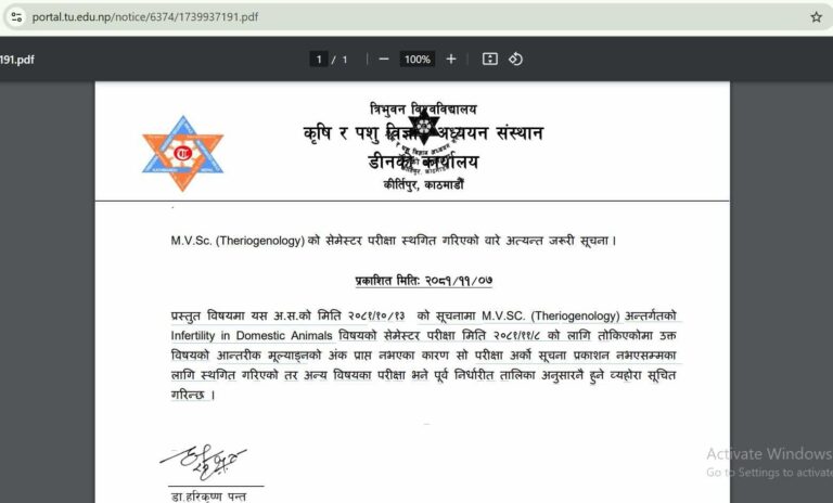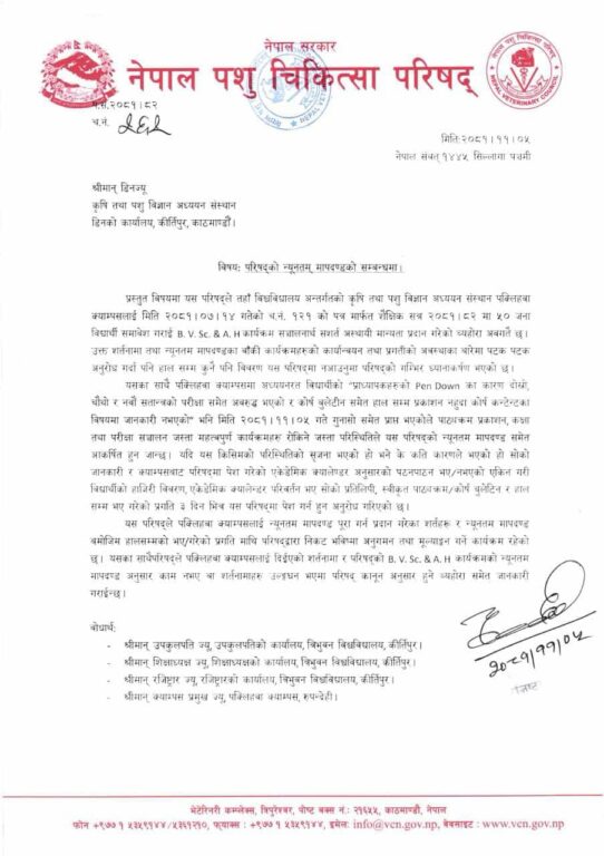 परिषद्ले भेटेनरी कार्यक्रमको स्वीकृत दिएको छ । क्याम्पसको पाठ्यक्रमलगायत सबै विषयमा स्वीकृत दिने स्थायी निकाय परिषद् हो । अस्थायी स्वीकृत दिएर संस्थानले भेटेरिनरी कार्यक्रम सञ्चालन गरिरहेको छ । परिषद्ले पठाएको पत्रमा क्याम्पसबाट परिषद्मा पेस गरेको एकेडेमी क्यालेन्डरअन्तर्गत पठनपाठन भए नभएको, विद्यार्थीको हाजिरी विवरण क्यालेन्डर परिवर्तन भए सोको प्रतिलिपि, स्वीकृत पाठ्यक्रम, कोर्स बुलेटिन र हालसम्म भएका प्रगति विवरण ३ दिनभित्र पेस गर्न अनुरोध गरेको छ ।