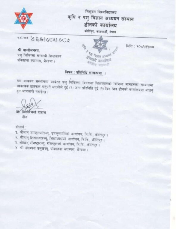 त्यस्तै, भेटेरिनरी संकायतर्फ एकमात्र विषय समितिलाई बढाएर तत्काल विषय समिति थप गर्नुपर्ने र दुरगामी महत्वसहित स्नातक र स्नातकोत्तरतह सञ्चालन गर्न भेटेरिनरी क्याम्पस स्थापना गर्नुपर्ने उल्लेख छ । पक्लिहवा क्याम्पसका प्राध्यापकले तीनैजना पदाधिकारीलाई ज्ञापनपत्र बुझाएका थिए ।