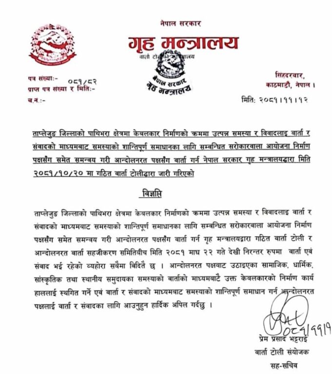 ताप्लेजुङ जिल्लाको पाथीभरा क्षेत्रमा केबलकार निर्माणको क्रममा उत्पन्न समस्या र विवादलाई वार्ता र संवादको माध्यमबाट समस्याको शान्तिपूर्ण समाधानका लागि सम्बन्धित सरोकारवाला आयोजना निर्माण पक्षसँग समेत समन्वय गरी आन्दोलनरत पक्षसँग वार्ता गर्न गृह मन्त्रालयद्वारा गठित वार्ता टोली र आन्दोलनरत वार्ता सहजीकरण समितिबिच मिति २०८१ माघ २२ गते देखी निरन्तर रुपमा वार्ता एवं संवाद भई रहेको व्यहोरा सबैमा विदितै छ । आन्दोलनरत पक्षबाट उठाइएका सामाजिक, धार्मिक, सांस्कृतिक तथा स्थानीय समुदायका समस्याको वार्ताको माध्यमबाटै उक्त केबलकारको निर्माण कार्य हाललाई स्थगित गर्ने एवं वार्ता र संवादको माध्यमबाट समस्याको शान्तिपूर्ण समाधान गर्न आन्दोलनरत पक्षलाई वार्ता र संवादका लागि आउनुहुन हार्दिक अपिल गर्दछु ।