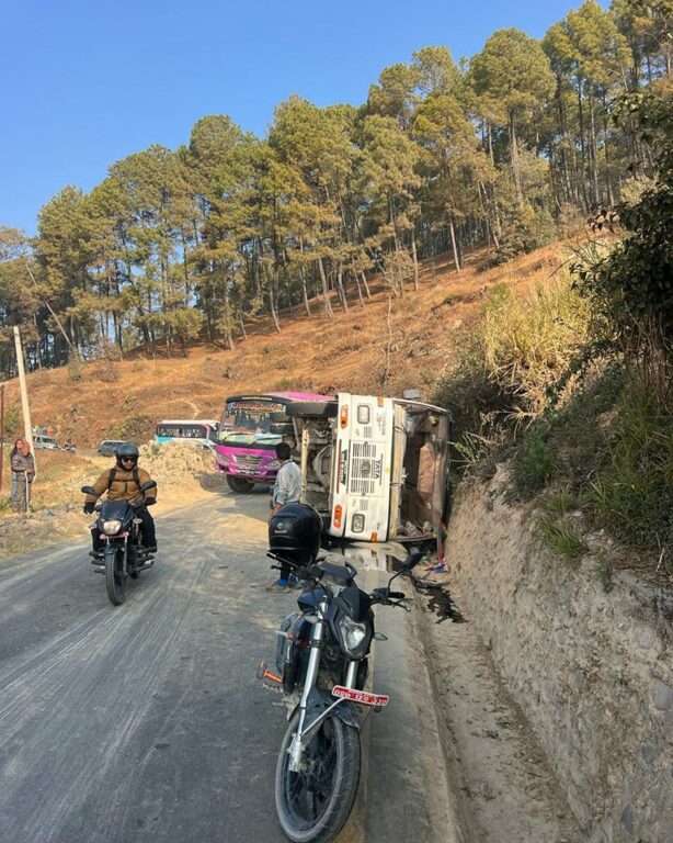 आफैँ अनियन्त्रित भई सडकको नालीमा पल्टिएर बस दुर्घटना हुँदा बसमा सवार चालक र सह–चालकसहित१७ जना घाइते भएका हुन्।