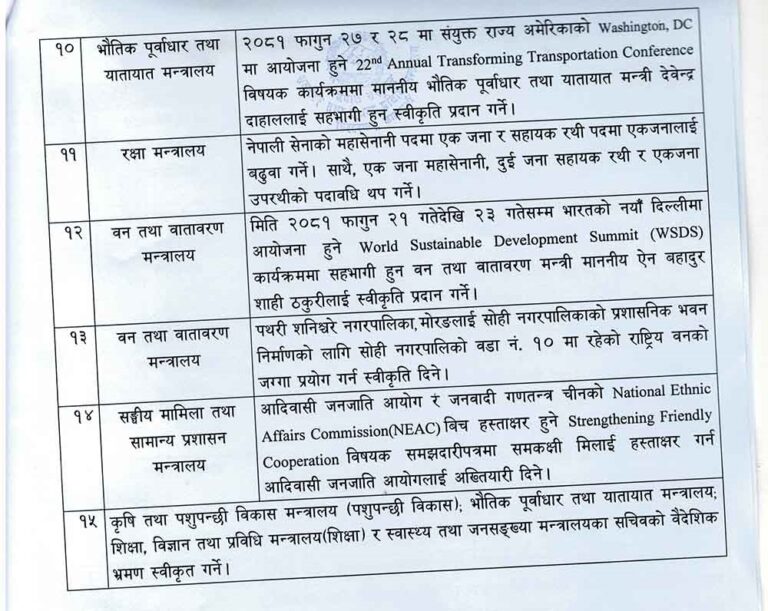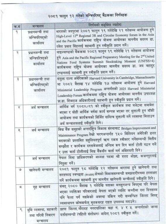 सरकारले मन्त्रिपरिषद् बैठकका निर्णय सार्वजनिक गरेको छ।मङ्गलबार सरकारका प्रवक्ता एवम् सञ्चार तथा सूचना प्रविधिमन्त्री पृथ्वीसुब्बा गुरुङले पत्रकार सम्मेलन गर्दै मन्त्रिपरिषद् बैठकका निर्णय सार्वजनिक गरेका हुन्।