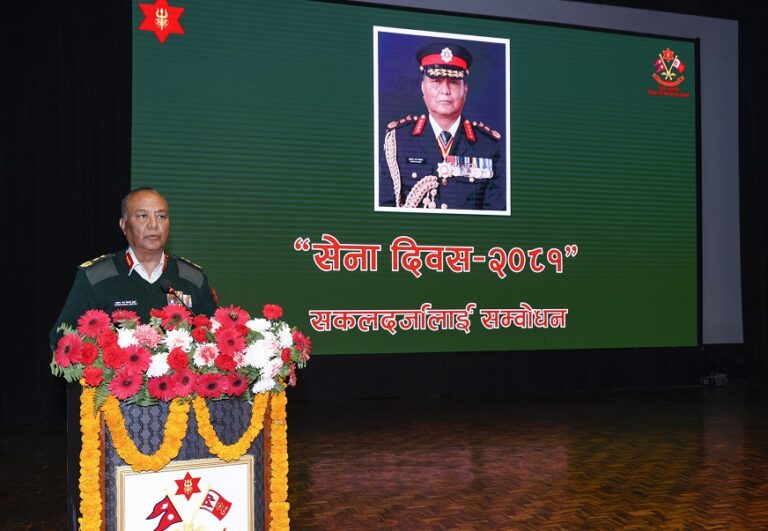 प्रधान सेनापति अशोक राज सिग्देलले महाशिवरात्रि तथा २६२औँ सेना दिवसको अवसरमा जंगी अड्डामा आयोजित विशेष कार्यक्रममा नेपाली सेनाका सकलदर्जालाई सम्बोधन गरेका छन् । प्रधान सेनापति सिग्देलले नेपाली सेनाका बहालवाला तथा अवकाश प्राप्त सकलदर्जा, सेनामा कार्यरत निजामती कर्मचारी एवं परिवारजनलाई शुभकामना समेत व्यक्त गरे।
