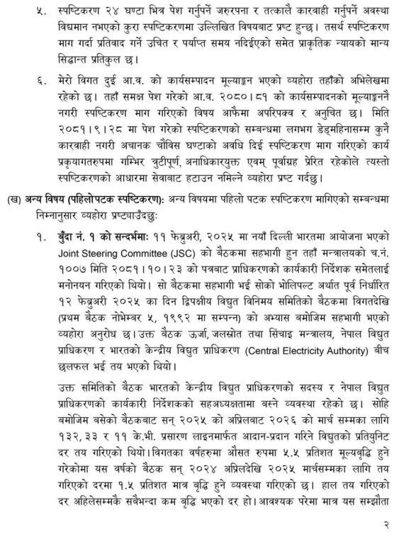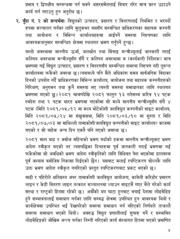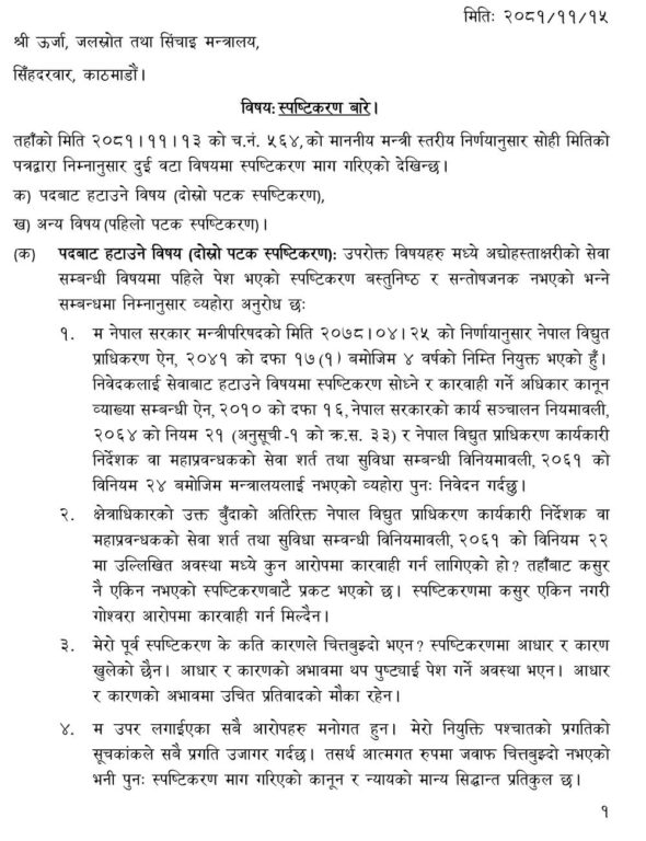 उनले भनेका छन्- ‘निवेदकलाई सेवाबाट हटाउने विषयमा स्पष्टीकरण सोध्ने र कारबाही गर्ने अधिकार कानुन व्याख्या सम्बन्धी ऐन, २०१० को दफा १६, नेपाल सरकारको कार्य सञ्चालन नियमावली, २०६४ को नियम २१ (अनुसूची – १ को क्र.स. ३३) र नेपाल विद्युत् प्राधिकरण कार्यकारी निर्देशक वा महाप्रवन्धकको सेवा शर्त तथा सुविधा सम्बन्धी विनियमावली, २०६१ को विनियम २४ बमोजिम मन्त्रालयलाई नभएको व्यहोरा पुनः निवेदन गर्दछु ।’